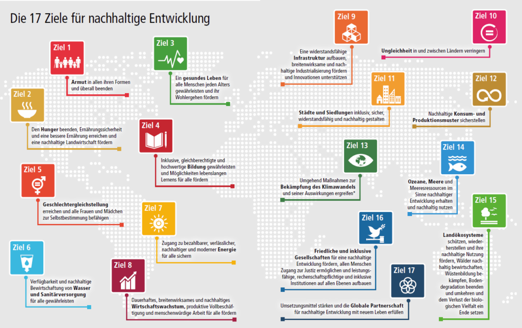 Bei der Agenda 2030 handelt es sich um ein Rahmenkonstrukt, das die Nachhaltigkeitspolitik der Vereinten Nationen für die nächsten 15 Jahre (Erstellung im Jahr 2015) abstecken soll. Ursprung der Agenda 2030 sind vor allem die Beschlüsse aus der Rio-Konferenz von 1992 und dem Millenniumsgipfel des Jahres 2000 und den daraus entstandenen „Millennium Development Goals“ (MDGs). Diese waren relativ stark auf die Themen Armutsbekämpfung und soziale Entwicklung begrenzt, wodurch sozioökonomische sowie ökologische Entwicklungen nicht bedient werden konnten. Beispielhaft für diese Entwicklungen sind die immer schneller wachsende Gesamtbevölkerung, die größer werdende Kluft zwischen Arm und Reich sowie auch die Beschleunigung des Klimawandels und des Artensterbens. Der Paradigmenwechsel wurde dann auf der Rio+20 Konferenz eingeläutet, in welcher erstmals die Notwendigkeit für umfangreichere Ziele für eine nachhaltige Entwicklung festgestellt wurde. Dabei wurde erkannt, dass die Ziele in Zukunft auf alle Länder der Welt anwendbar sein sollten und nicht nur auf den ärmeren globalen Süden. Nach vielen Diskussions- und Verhandlungsrunden wurden dann im September 2015 auf dem New Yorker Gipfel 17 SDGs und daraus abgeleitet 169 Zielvorgaben final vorgestellt. Die übergeordneten Ziele können in der nachfolgenden Grafik nachgelesen werden.