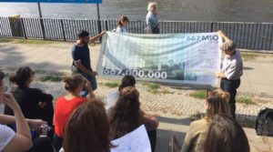 Am Uferweg am Spreekanal malt Christoph mit Kreide eine große Badewanne mit einem großen Wasserhahn. Der „Wasserstand“ in der Badewanne verdeutlicht das bisher von Menschen verbrauchte CO2. Gerade fossile Brennstoffe, die Jahrmillionen unter der Erde lagen und nun in den sensiblen Kreislauf eingebracht werden, sind CO2 Treiber oder bildlich gesprochen ein dicker Strahl in die CO2 Wanne. Natürlich kann man über Baumpflanzungen oder andere Methoden das CO2 wieder der Atmosphäre entziehen, aber einfacher und billiger ist es, CO2 gar nicht erst in die Atmosphäre zu pumpen.