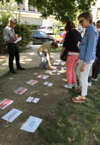 „+ 0,25 Grad Celsius, gehört das zum Jahr 1960 oder später?“ Wir stehen am Mittwochnachmittag, den 21. August am Berliner Spittelmarkt und überlegen, wie wir die Klima-Daten, die uns Christoph Meyer auf Zetteln in die Hand gedrückt hat, den entsprechenden Jahren zuordnen.