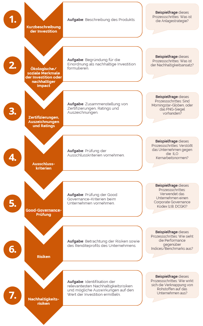 Der letzte Schritt im Analyseprozess besteht darin, die Informationen zusammenzutragen und zu bewerten. Für uns besonders wichtig: die Bewertung findet im Sechs-Augen-Prinzip statt. Dem voran gestellt, geht eine intensive Diskussion der Kontroversen voraus. Dieser Schritt soll die Bewertung objektivieren und die Nachhaltigkeitsbewertung valider machen. Die Bewertung übersetzt eine punktuelle Benotung dann in „Nachhaltigkeitsklassen“, die dem Schema der Energieeffizienzklassen folgt.